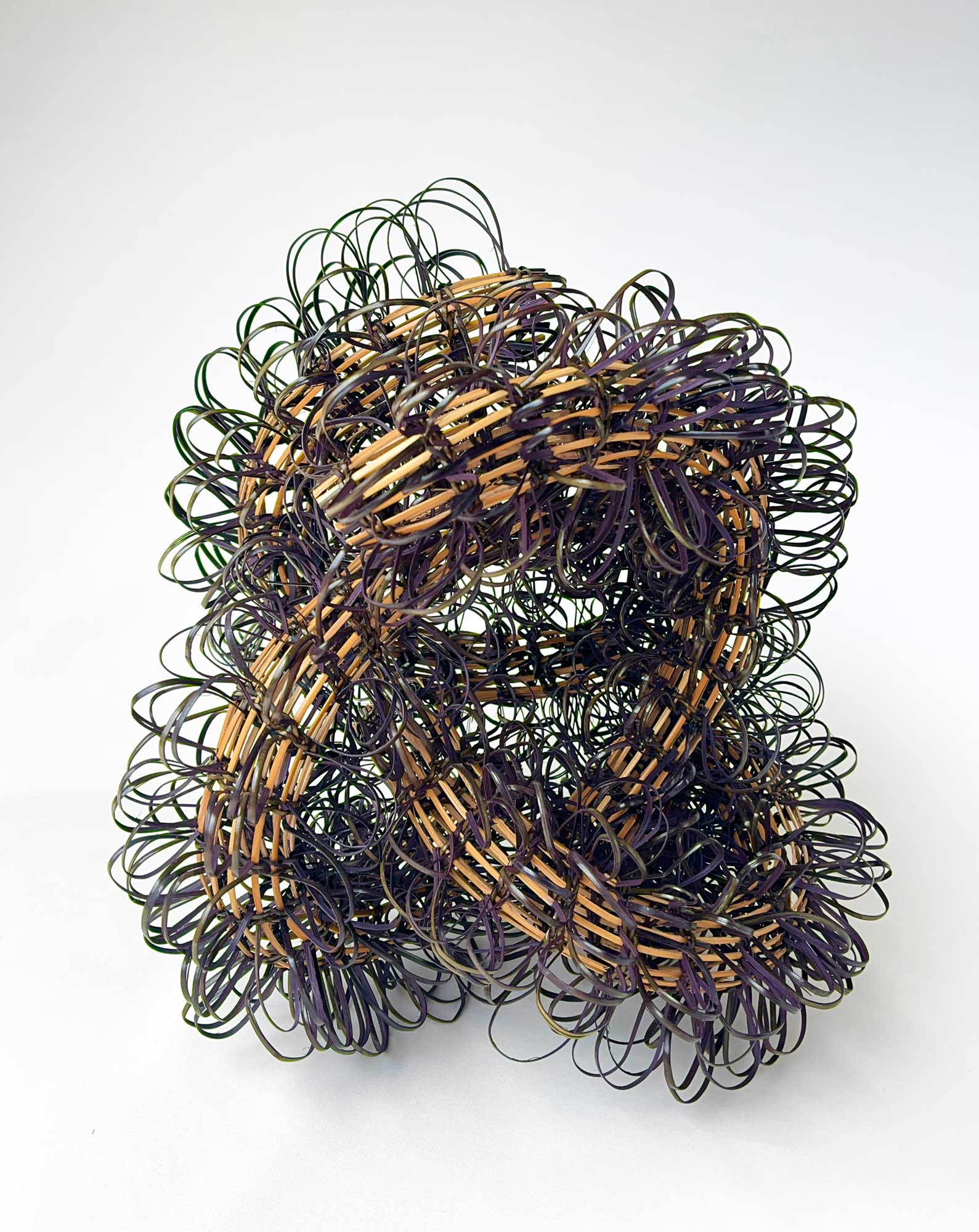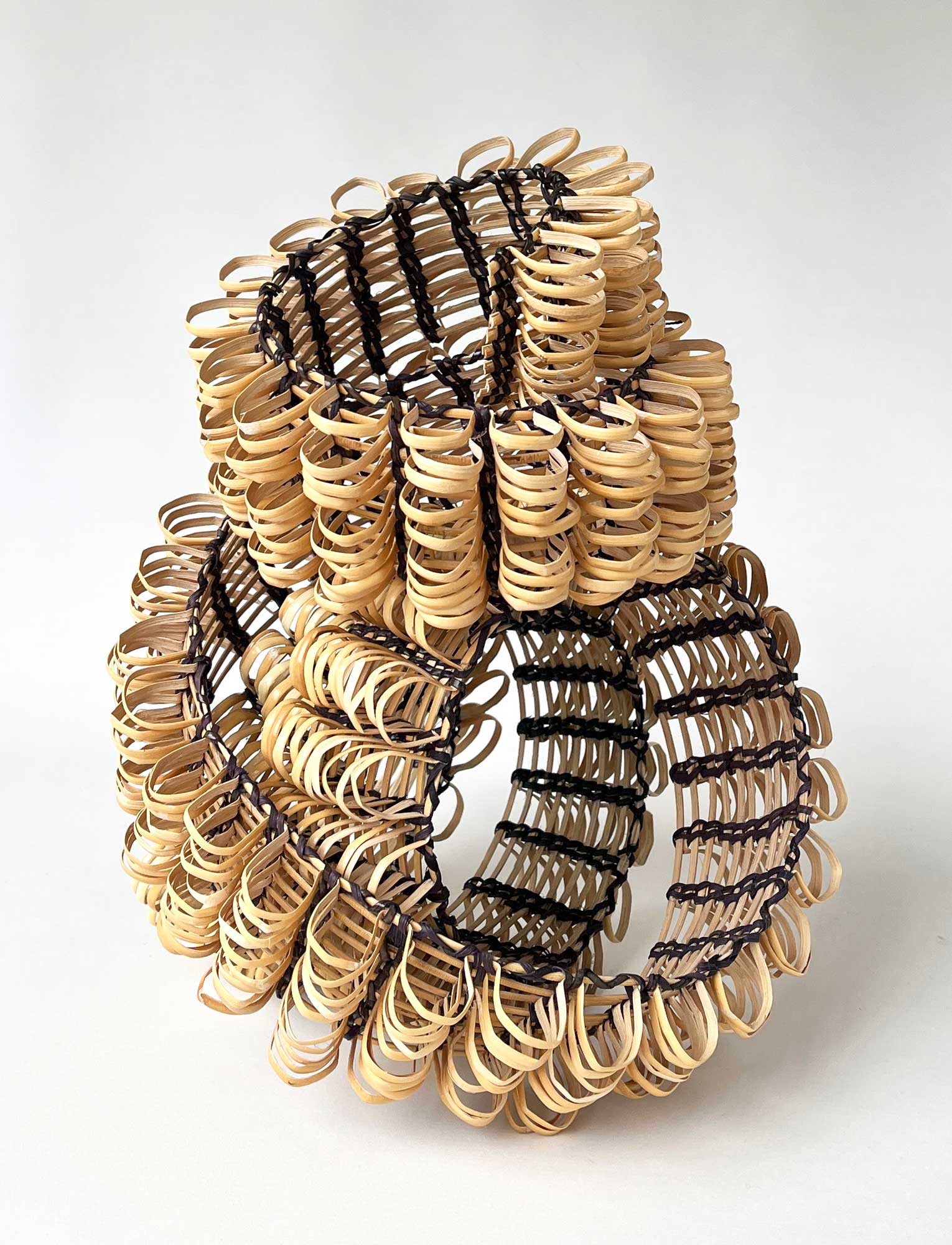 『 私にとって、想像上の動きやフォルムについて考え試行錯誤を経て、それを具体的な形態に表現する事は、非常に興味深い事である。 編み組みの世界では、多くの思わぬ動きの可能性が潜んでいる。この変幻に富んだ性質は予想を超える魅力的な形を生み出す。 』