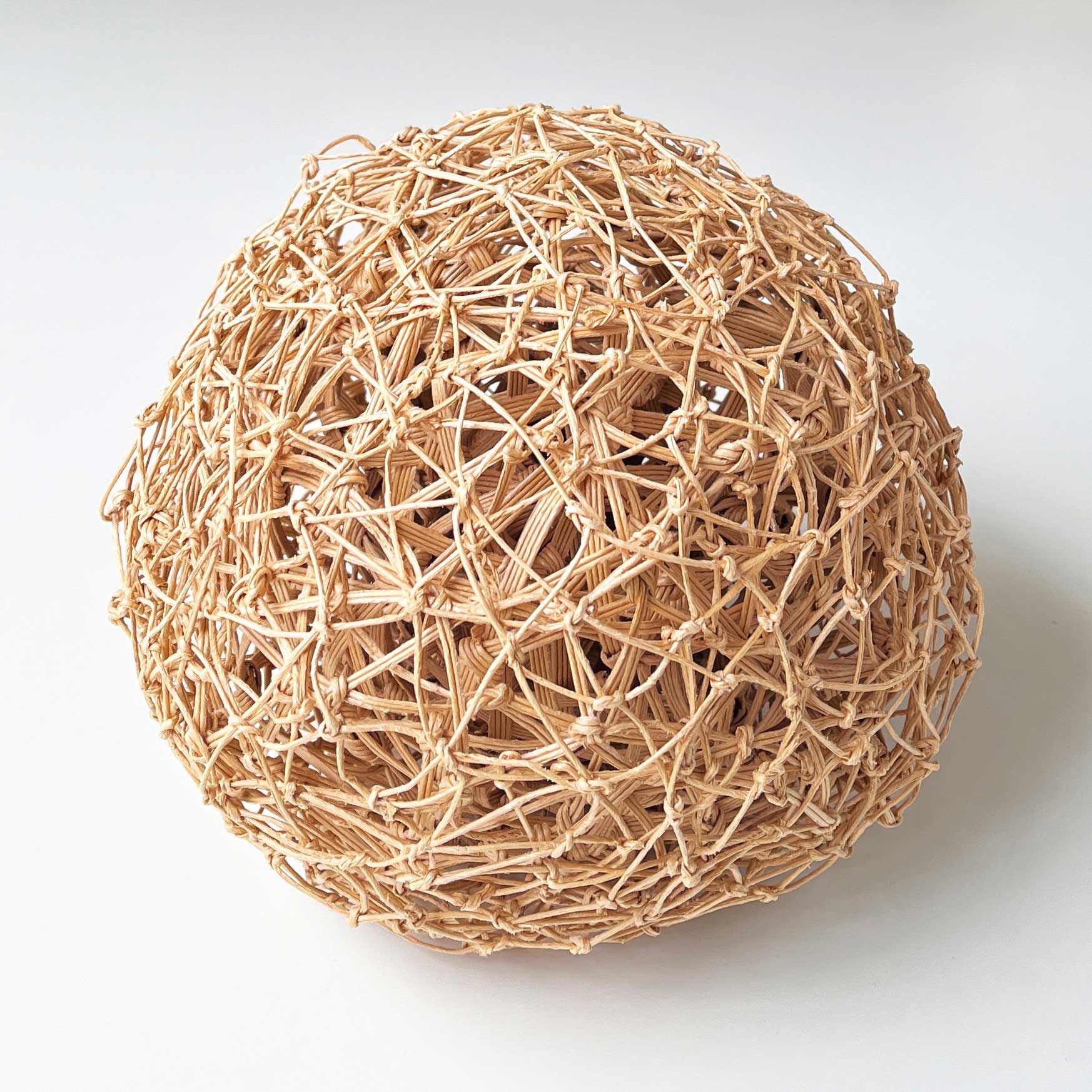 Air シリーズの7作品目。同じ素材と技法を使い展開してきた。皮籐を使うのは、バッグ制作で普段から使い馴染みのある素材であるということが主な理由である。 バッグ制作の場合は面で構成していくが、発想を転換させて特徴を生かし違った魅力を引き出したく用いている。今回のテーマは「継続」である。今までは一方方向だった制作工程に逆方向の捻じりを加えて、連続性を可能にした。