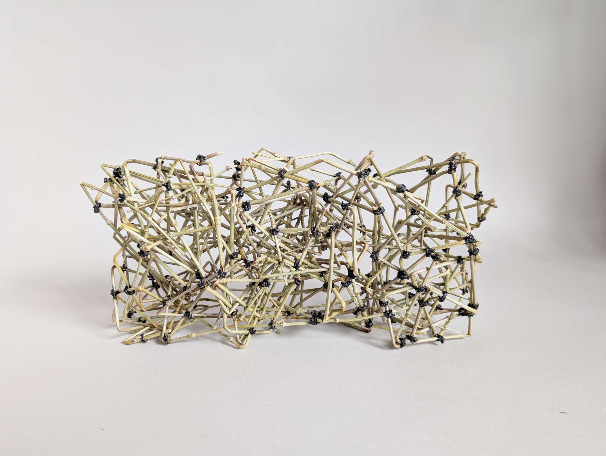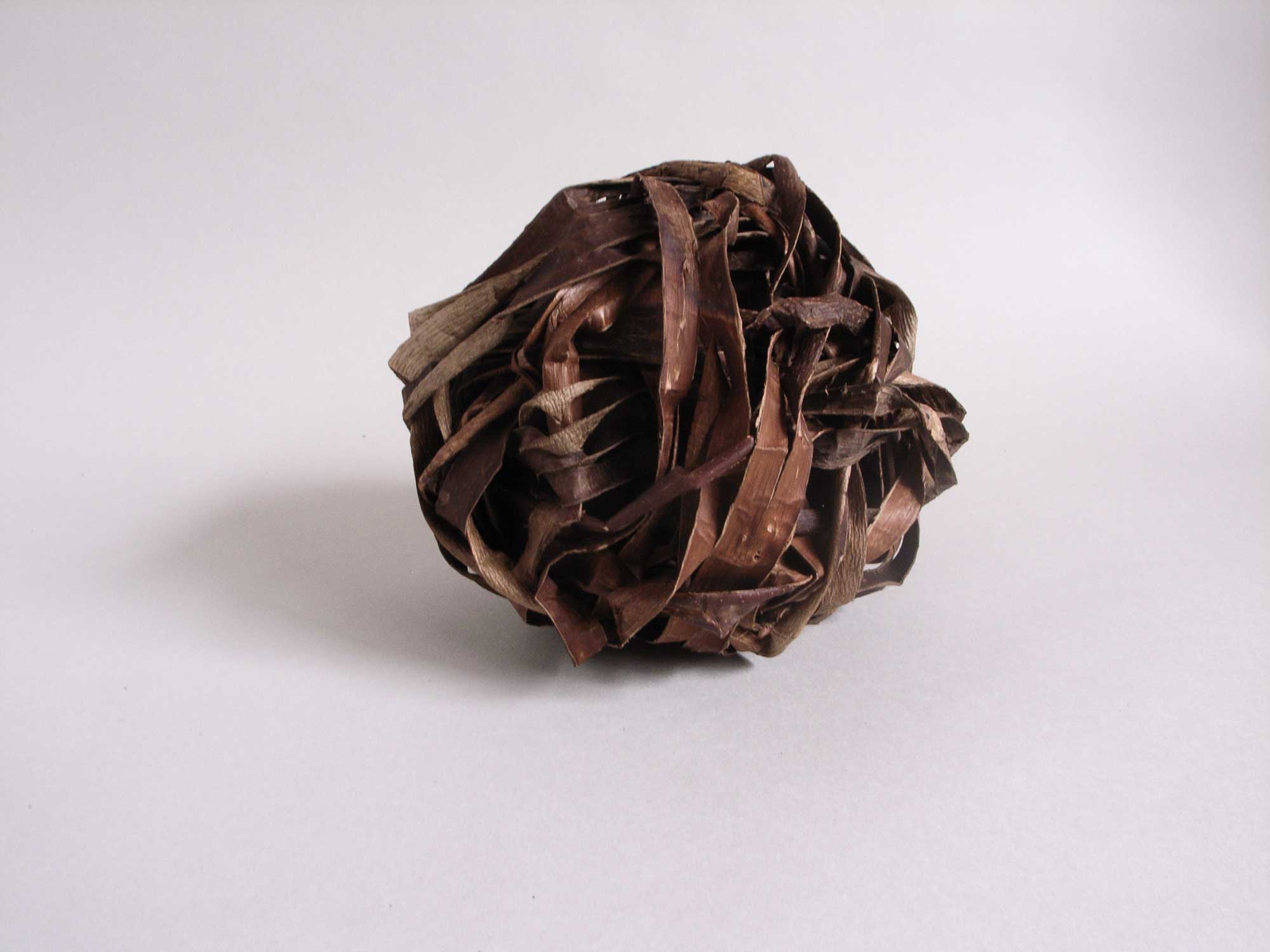 未だ平穏だった2019年の末、文化人類学の写真展で、アラビアの女性が、マットを作る材料として、ナツメヤシの葉を二本飛び網代の帯に組む様を見た。出来た帯は巻き取られて直径1mにもなっていた。後から帯を同心円状に展開し、その縁を細紐で綴り合わせると網代がピッタリかみあって、要素が一体になる。 地中海沿岸や中近東で見られる技法の知恵に感激を新たにし、コロナ禍で雑念に悩まされる中、私は、これをヒントに、いつもと違う順序で形を考える実験をした。作品のタイトルは「材料の準備段階と成形段階を分離して行った」ことを現している。