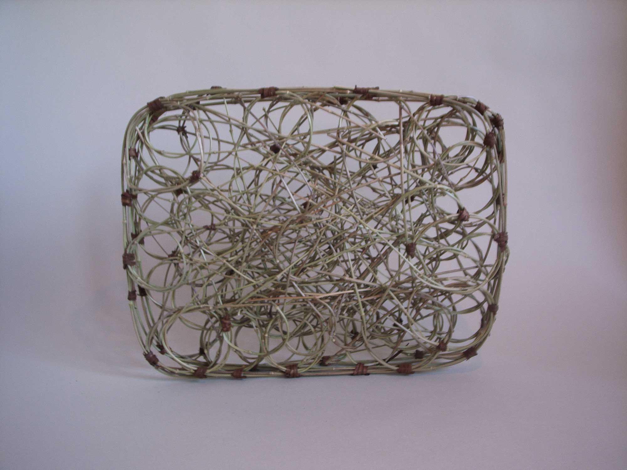 『 私は長年、樹皮や蔓などを組織して、かごに似た小立体を作ってきた。かごのかたちや機能には、パズルのようにいろいろな観念が組み込まれていて魅力的だ。再発見した面白さを私の暗号に置き換えて、再びかたちに仕立てていく。多種の植物を出来るだけ自分で集めて、性質を観察し独創的な構造を見つけるという実験的な方法をとっている。この二つでは、立体の縁に対して水平垂直を成す組織(織り構造)では窪みが45度の傾斜で入り、斜めの組織(組み構造)では窪みが90度に入ることを対象させている。いつでも形には私が関心を持ったことが含まれているのだが、構造の対比のテーマには長年取り組んでいる。 』
