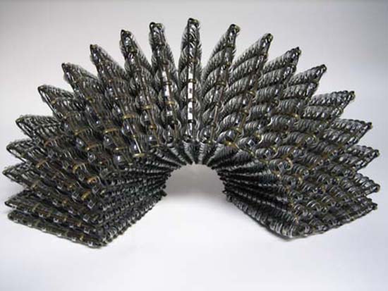 『 私にとって、想像上の動きやフォルムについて考え試行錯誤を経て、それを具体的な形態に表現する事は、非常に興味深い事である。 編み組みの世界では、多くの思わぬ動きの可能性が潜んでいる。この変幻に富んだ性質は予想を超える魅力的な形を生み出す。 』
