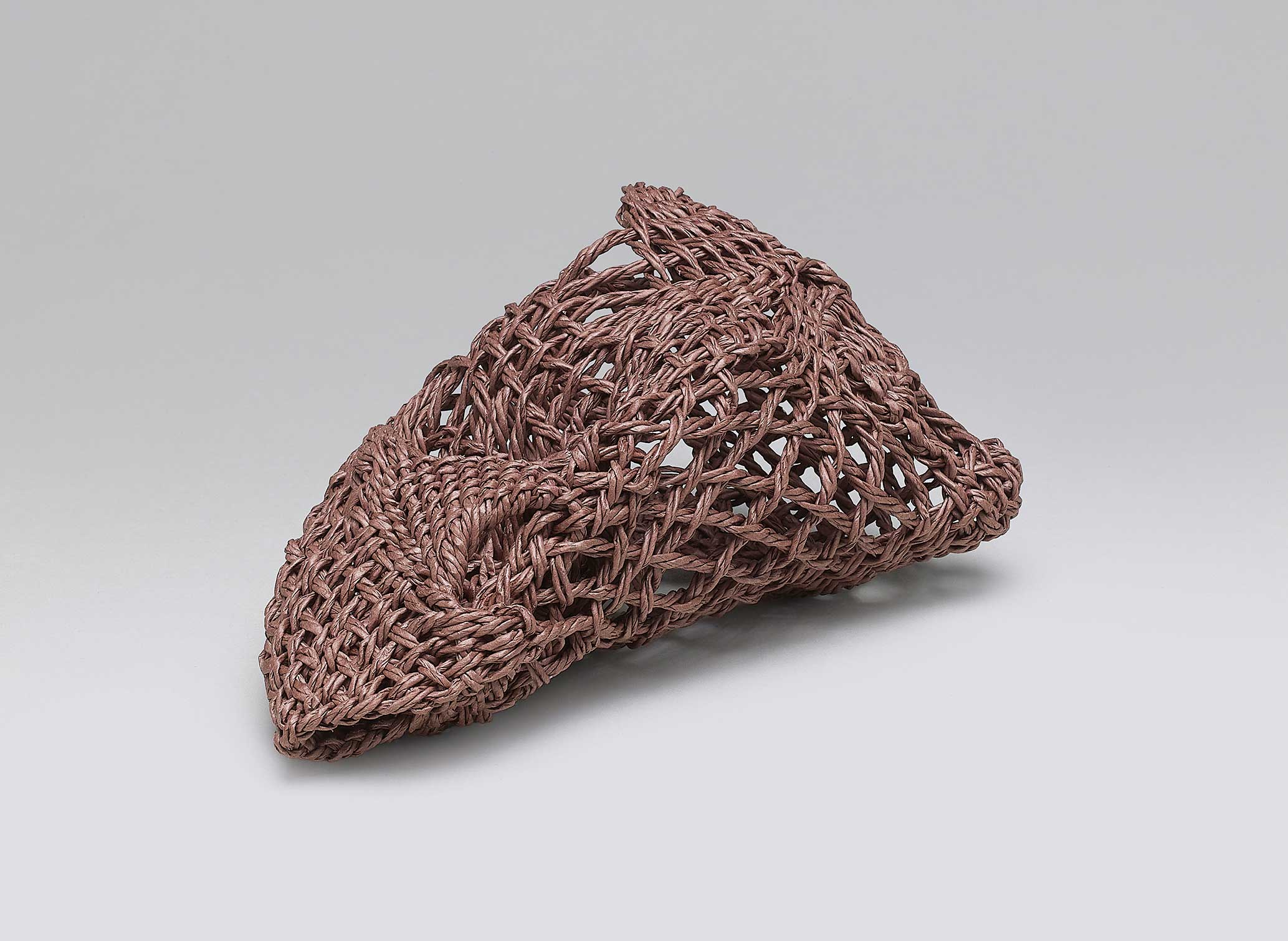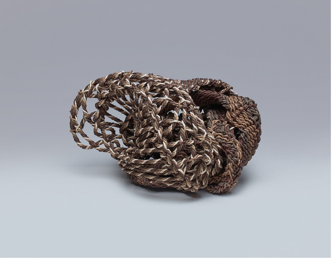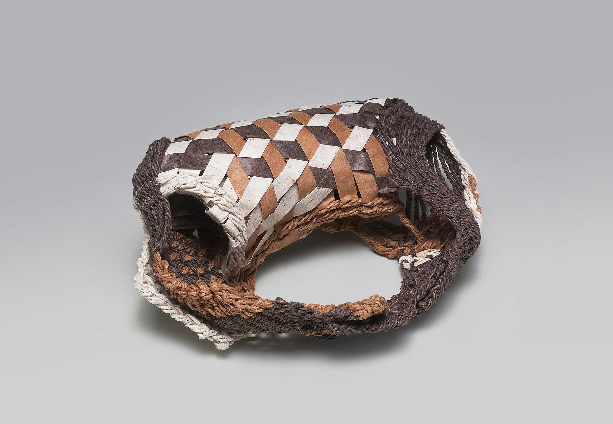 「ブルキナファソの技法はタテ芯を編みつなぐ技法ですが、そのタテ芯を撚りヒモにすることによって、プライ・スプリット技法との併用を試みました。」