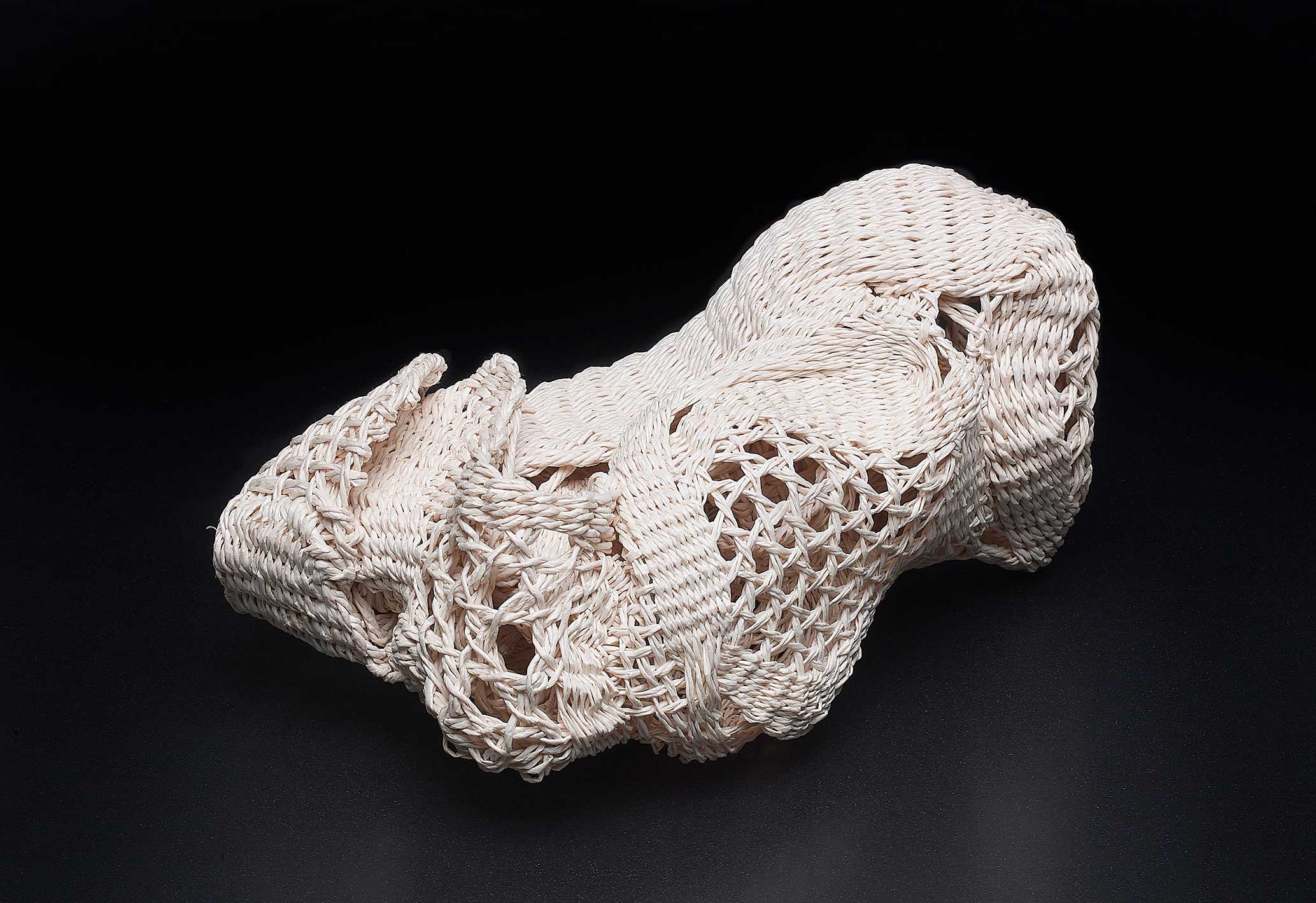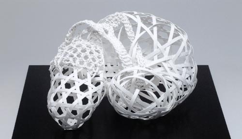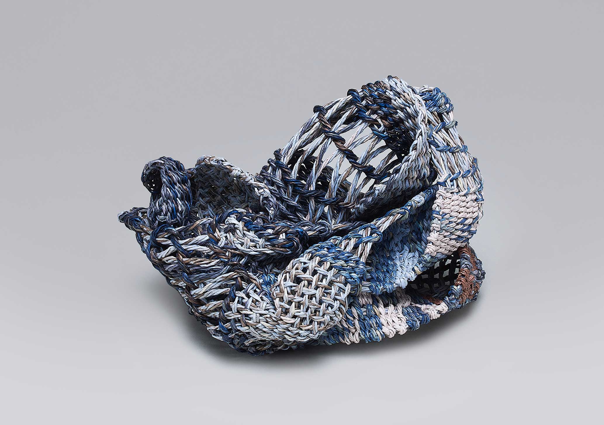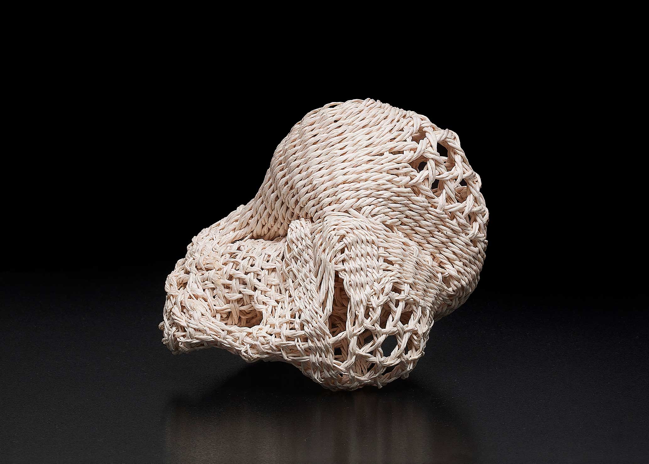 「ブルキナファソの技法はタテ芯を編みつなぐ技法ですが、そのタテ芯を撚りヒモにすることによって、プライ・スプリット技法との併用を試みました。」