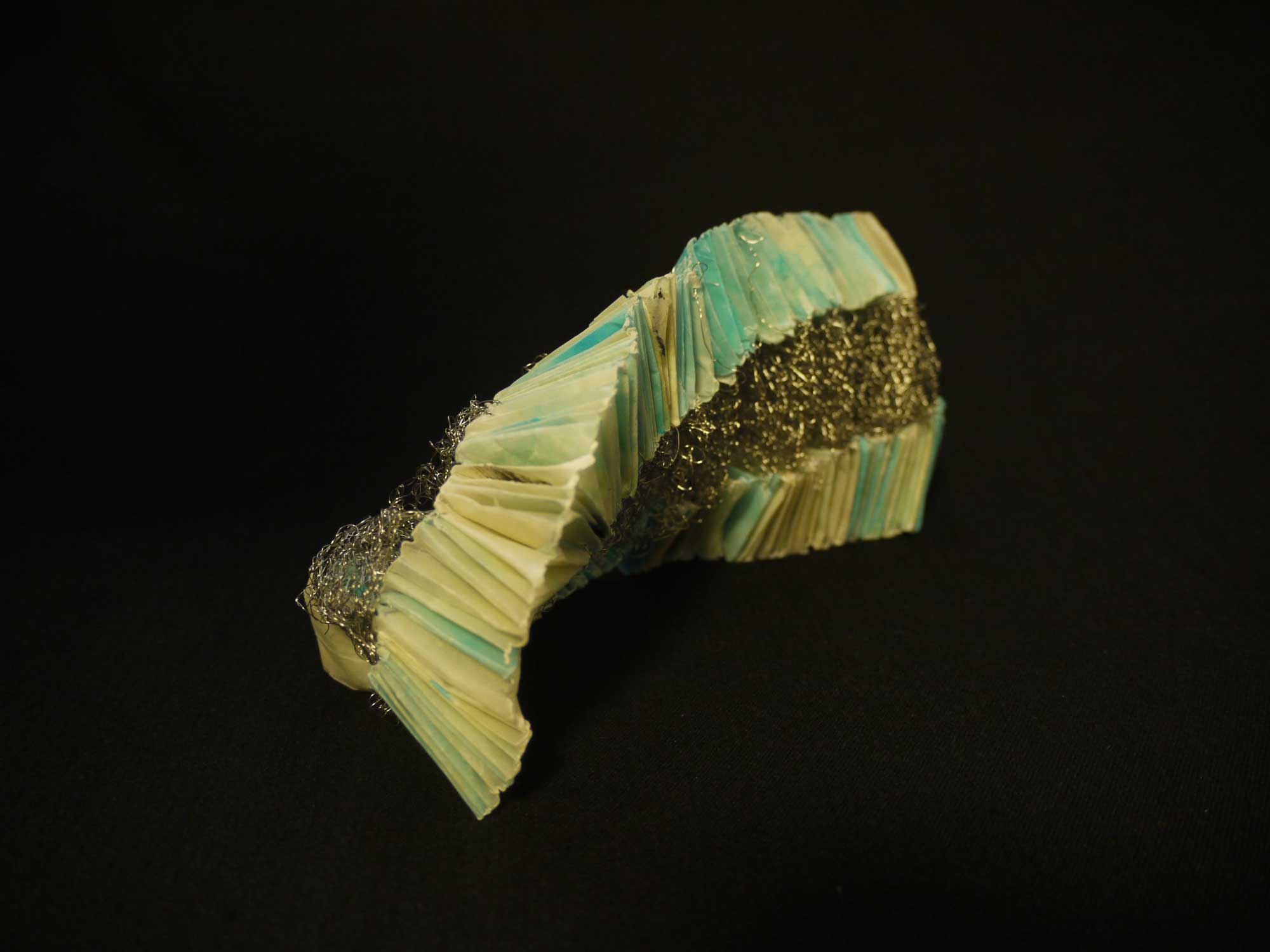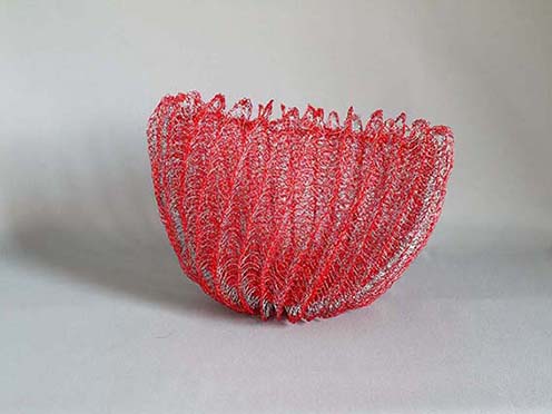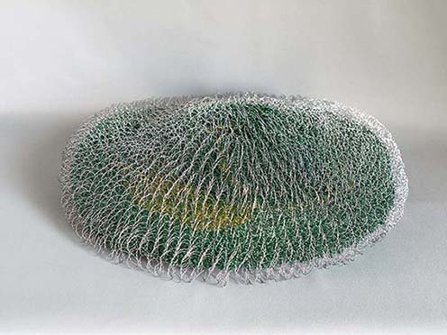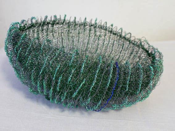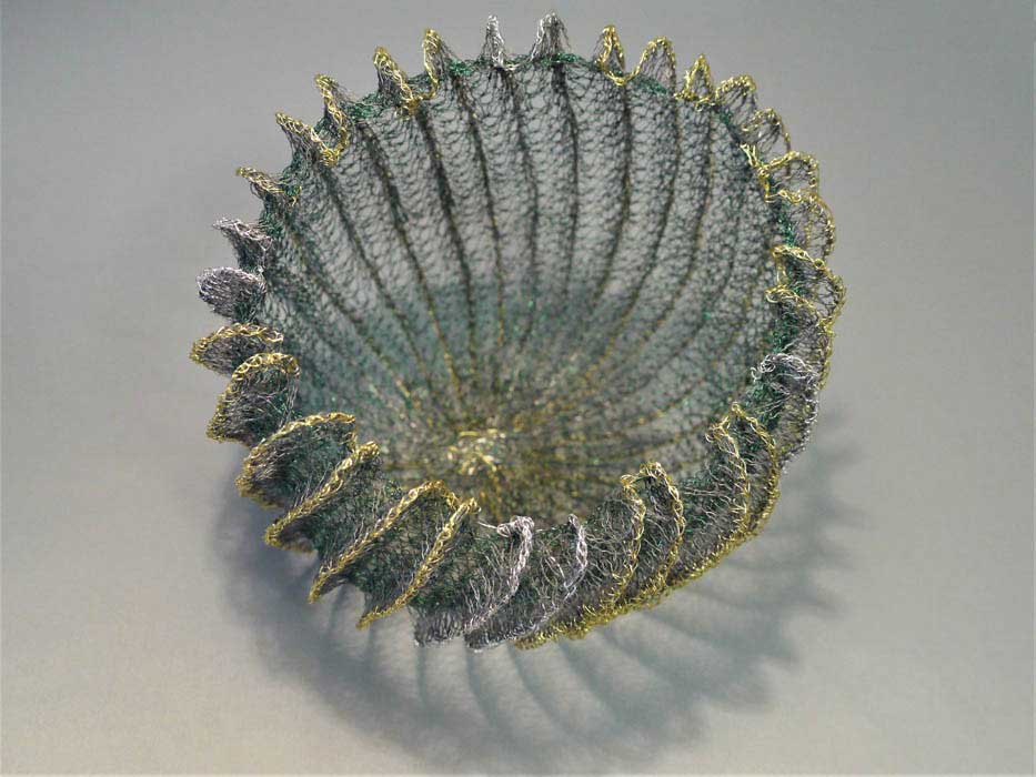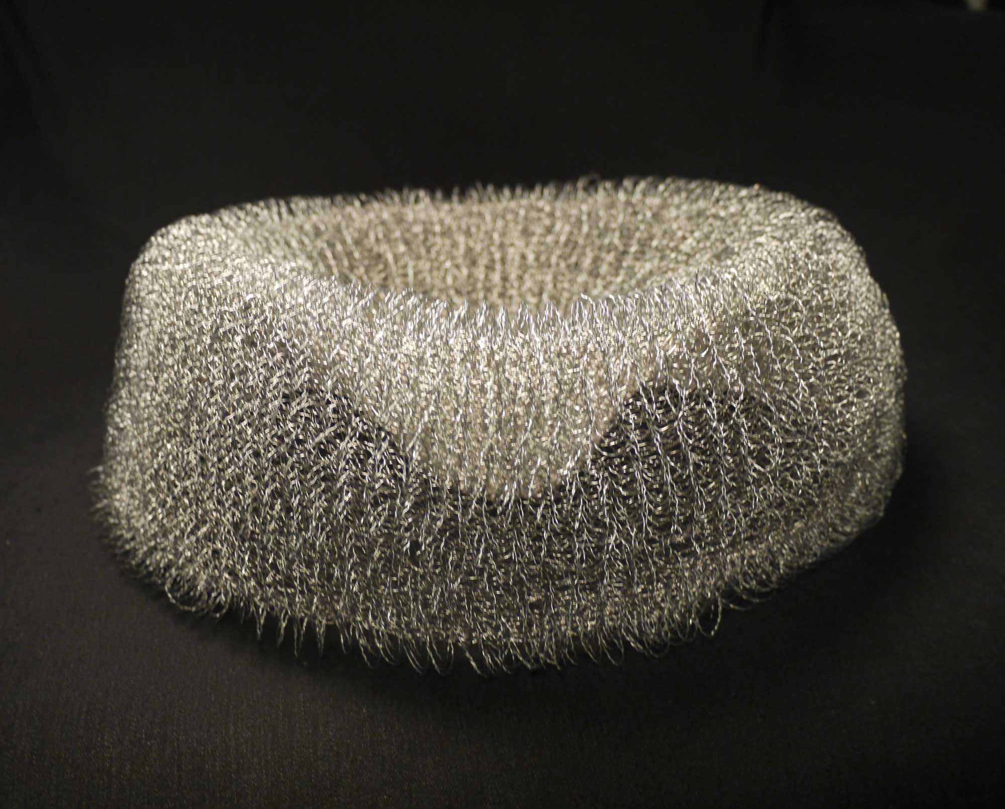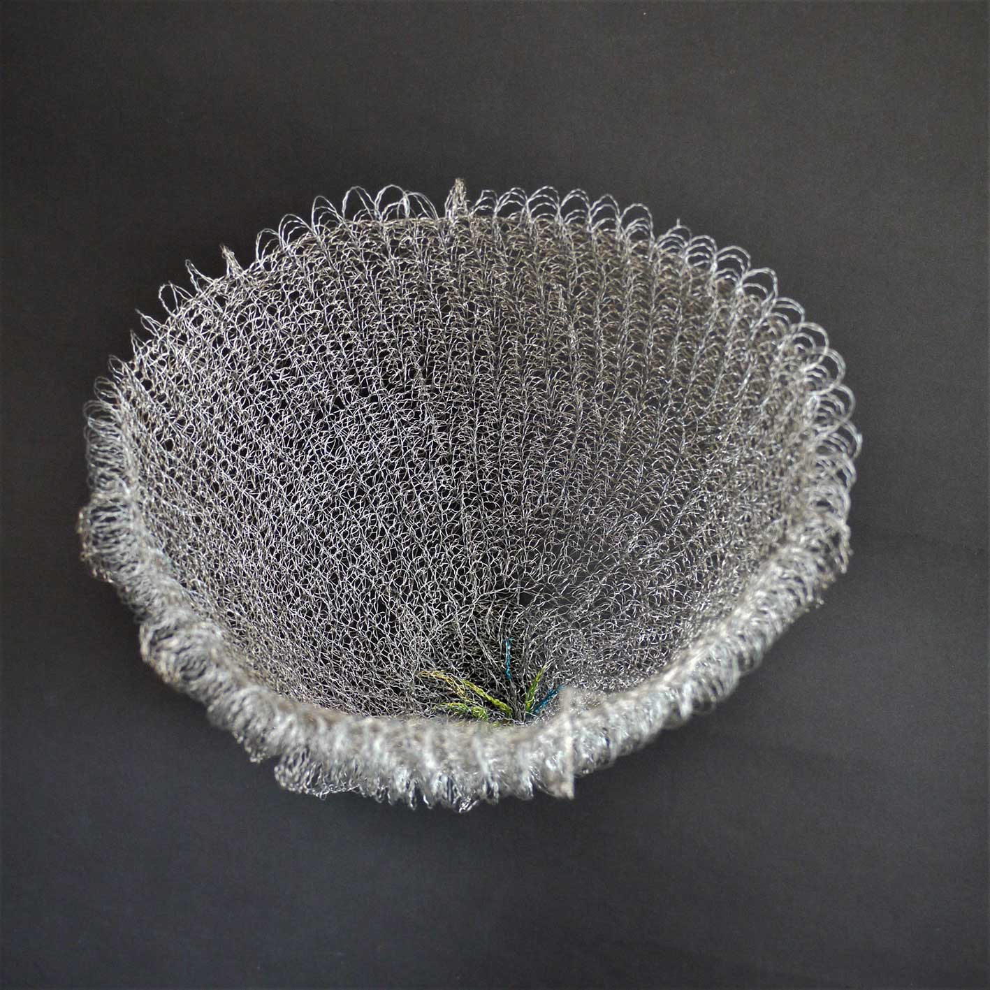 「 静かなキラキラした雪の輝きを思いながら作成。手作業で小さな木の棒に巻き付けてコイルした亜鉛ワイヤーと0.2mmのステンレス線ワイヤーを合わせて編んでいます。 作品の底に銅線ワイヤー(色付き)で輝きを入れました。」