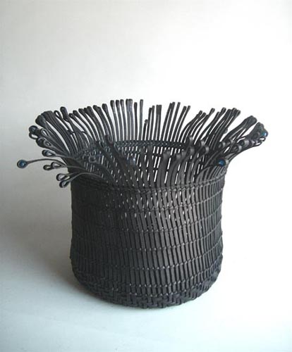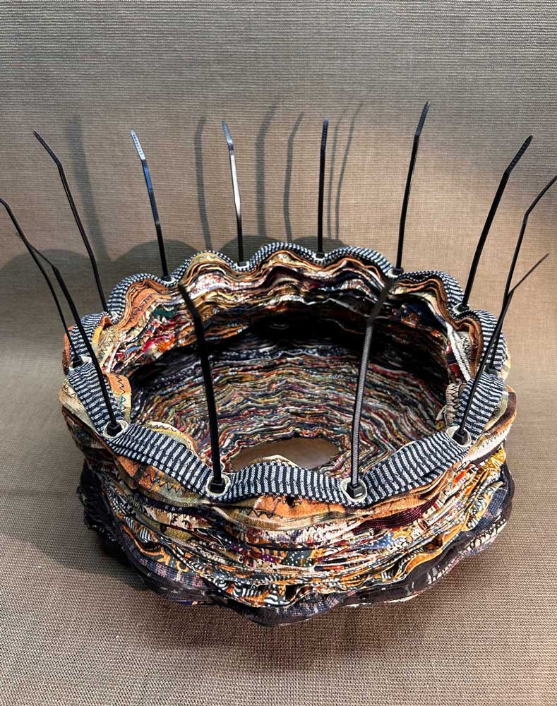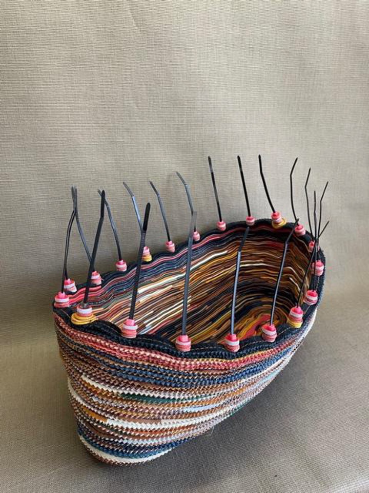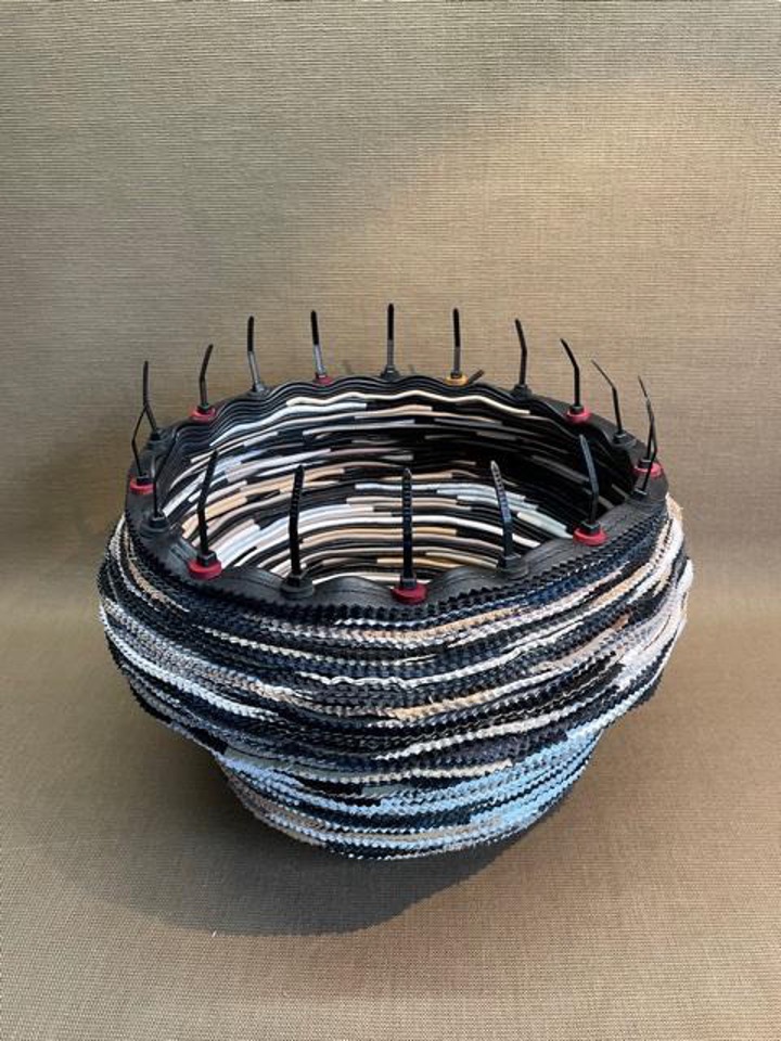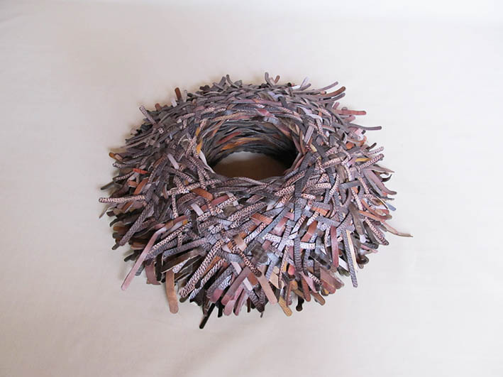 「“Heaps”シリーズ19作目です。今回は初期 中期 合わせて3点の出品?となります。Pierced Coiliing と技法名を勝手に付けていますが、、、らせん状に積み上がってゆく横材の中に縦材のタイバンドが隠れているので重なりが作る色やパタ-ンが楽しめます。作意と偶然、相半ばの結果です。」