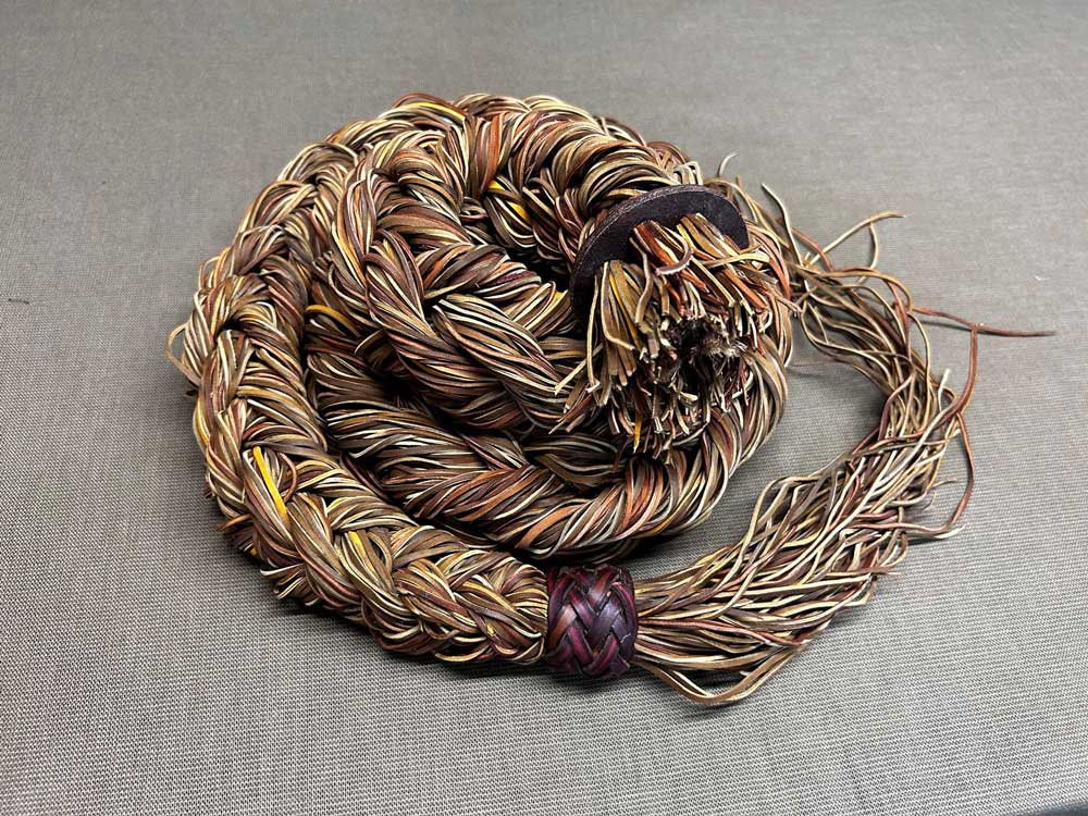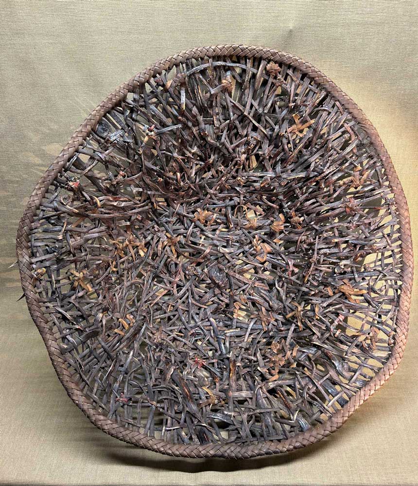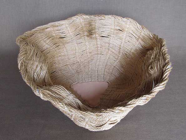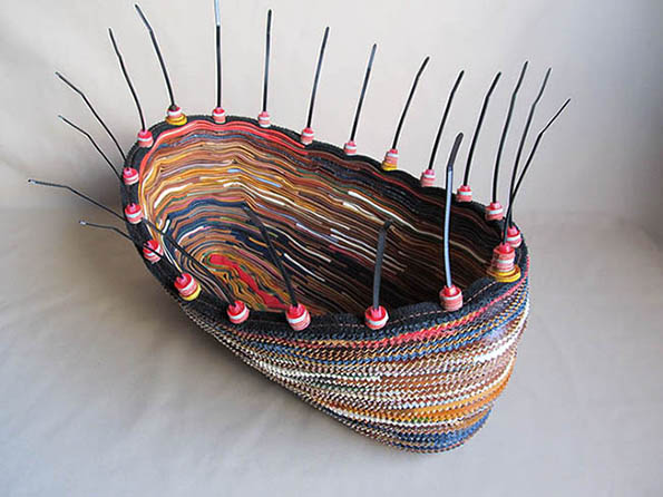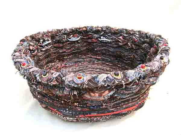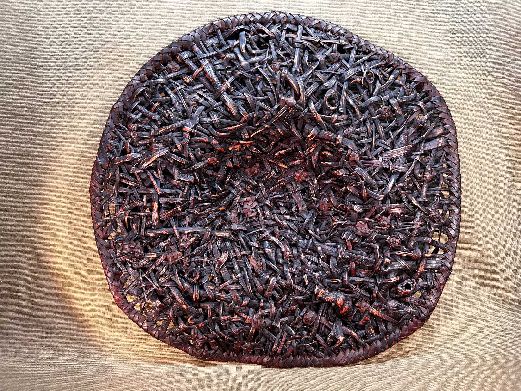 「“Heaps”シリーズ19作目です。今回は初期 中期 合わせて3点の出品?となります。Pierced Coiliing と技法名を勝手に付けていますが、、、らせん状に積み上がってゆく横材の中に縦材のタイバンドが隠れているので重なりが作る色やパタ-ンが楽しめます。作意と偶然、相半ばの結果です。」