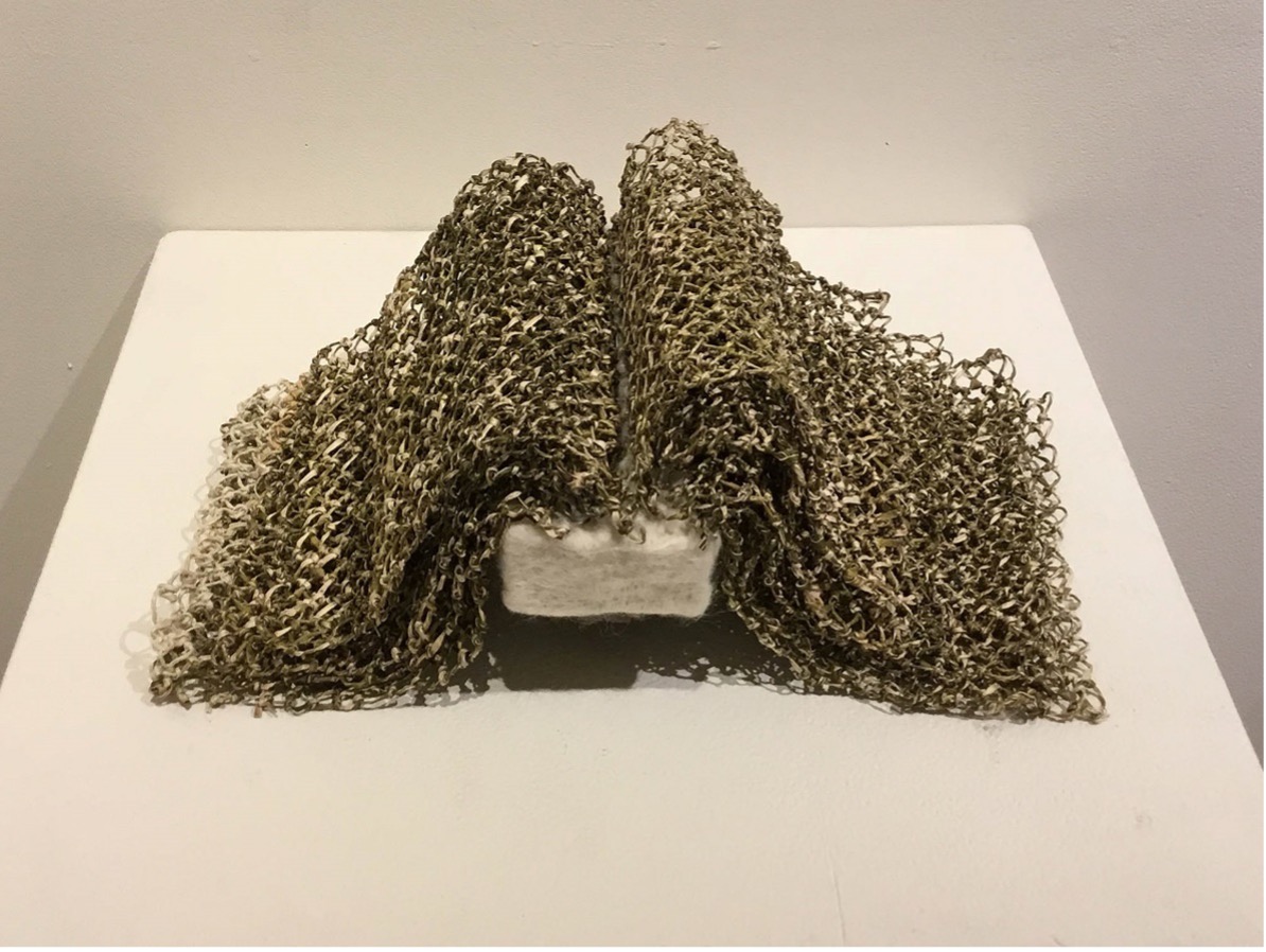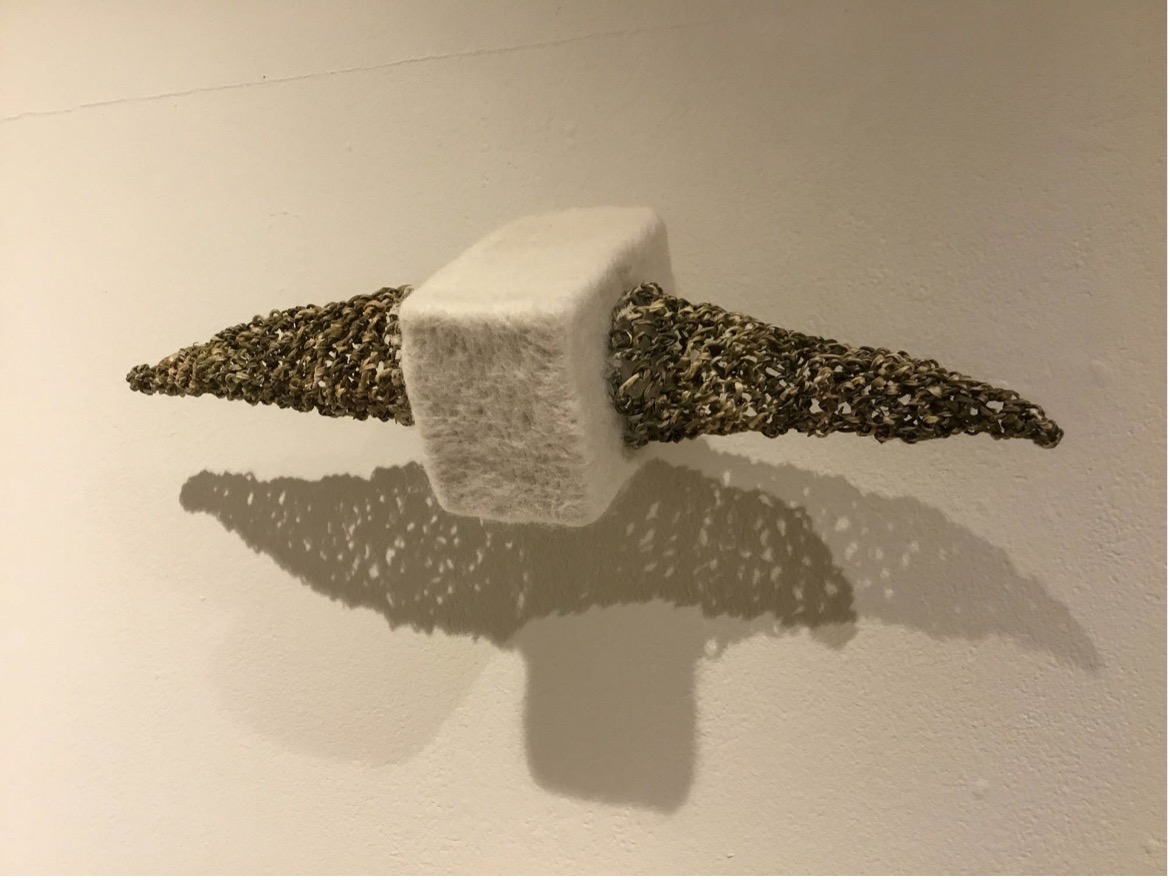 羊毛を立体フェルトにしたものと楮を漁網編みで立体にしたものを合わせてみた。まったくの異素材ですが、お互い自然素材なのでさほど違和感はない。 以前も羊毛と自然素材を合わせて作品を制作していましたが、その頃はフェルトの作り方が石鹸と熱湯で固めるものだったので、制作にはずいぶん無理があった。 今は羊毛にひたすら専用の針を刺すことで形づくっていくので テーブルの上で制作できる。見る側に少しでも興味を持ってもらえればうれしい。