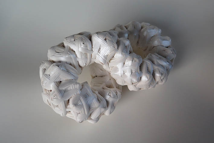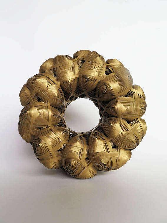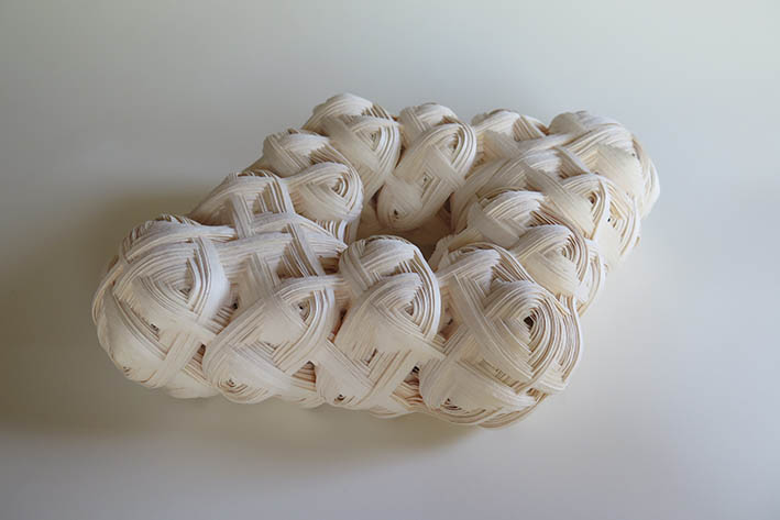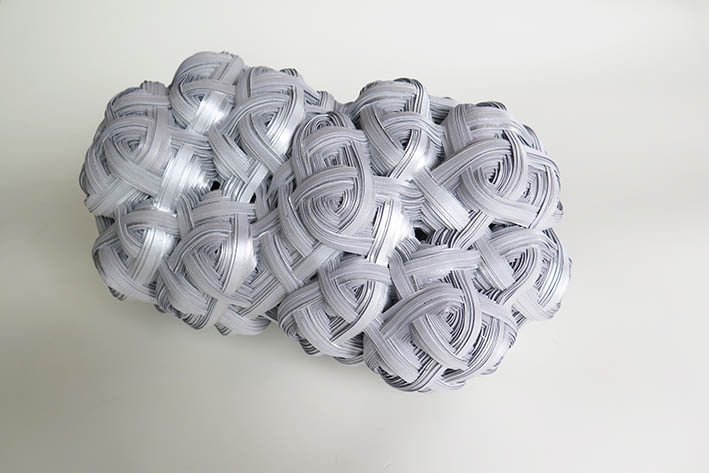 私の作品は、かごがそうであるように線状の素材を編んだり組んだりして、素材が繋がり組織ができるのですが、その繋がり方に興味があり、さまざまな繋がりの状態を作り出したいと考えています。